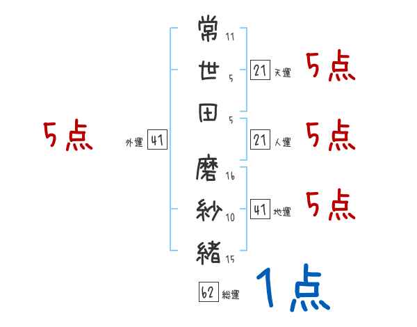 天運![]() | 常世田磨紗緒さんの天運は21画の5つ星!統率力がある。独立し成功する。名誉を手に入れる。 家系が持つ宿命的な運勢を表します。祖先から受け継いだ苗字ですので自分の力が及びません。家柄を象徴します。 |