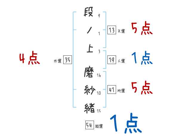 外運![]() | 段ノ上磨紗緒さんの外運は35画の4つ星!温厚な性格で感受性が高い。穏和な性格で人望が厚い。 生活面を象徴する運勢です。外部から受ける影響力を表し、結婚運、家庭運や職場、環境への順応性を表します。 |