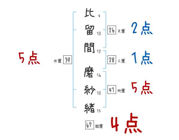 外運![]() | 比留間磨紗緒さんの外運は39画の5つ星!社交性に優れ人望が厚い。人の上に立ち成功する。 生活面を象徴する運勢です。外部から受ける影響力を表し、結婚運、家庭運や職場、環境への順応性を表します。 |
