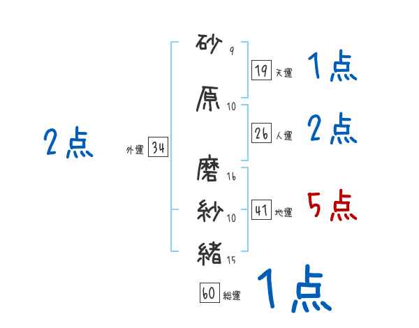 外運![]() | 砂原磨紗緒さんの外運は34画の2つ星!独創性に優れるが、自尊心が強く災難に注意しましょう。 生活面を象徴する運勢です。外部から受ける影響力を表し、結婚運、家庭運や職場、環境への順応性を表します。 |