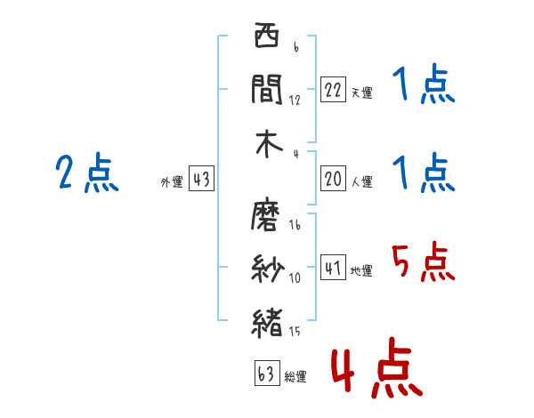西間木磨紗緒さんの画数の鑑定結果