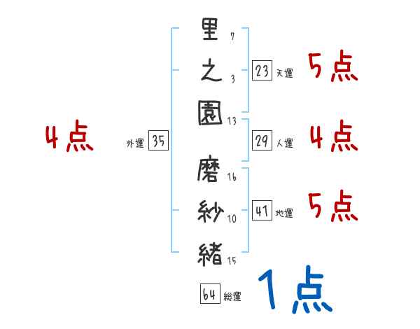 天運![]() | 里之園磨紗緒さんの天運は23画の5つ星!想像力に優れ活力がある。一代で成功し名誉を手に入れる。 家系が持つ宿命的な運勢を表します。祖先から受け継いだ苗字ですので自分の力が及びません。家柄を象徴します。 |