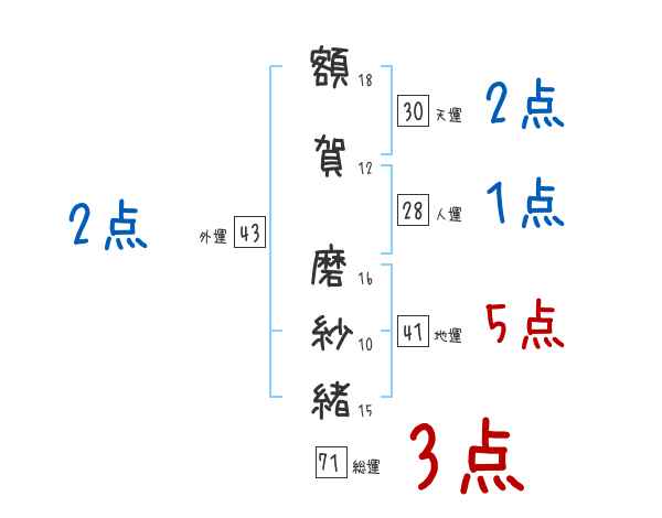 外運![]() | 額賀磨紗緒さんの外運は43画の2つ星!頑固な性格で独立心が強いかも。やや非現実的で浪費に注意しましょう。 生活面を象徴する運勢です。外部から受ける影響力を表し、結婚運、家庭運や職場、環境への順応性を表します。 |