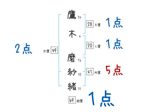 天運![]() | 鷹木磨紗緒さんの天運は28画の1つ星!家庭環境に注意。スポーツで活躍できる能力があるかも。 家系が持つ宿命的な運勢を表します。祖先から受け継いだ苗字ですので自分の力が及びません。家柄を象徴します。 |