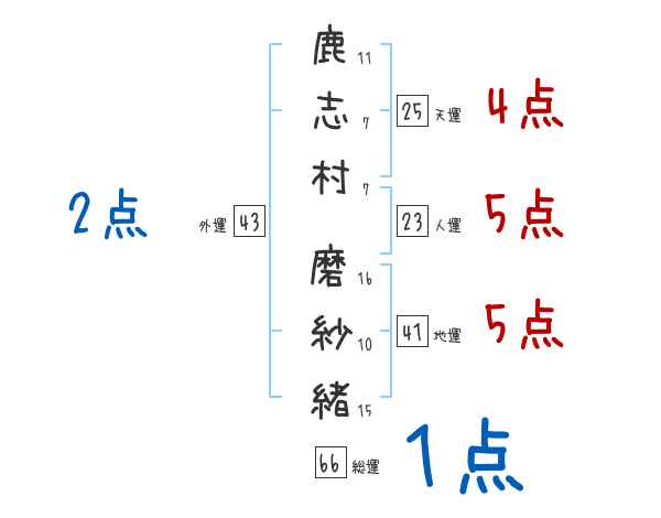 総運![]() | 鹿志村磨紗緒さんの総運は66画の1つ星!迷うことが多く挫折しやすい傾向が。辛抱強く物事に取り組みましょう。 あなたの人生を表す1番重要な運勢です。生涯を通じて影響する総合運となり、主に50歳以降の晩年期に影響を及ぼします。 |