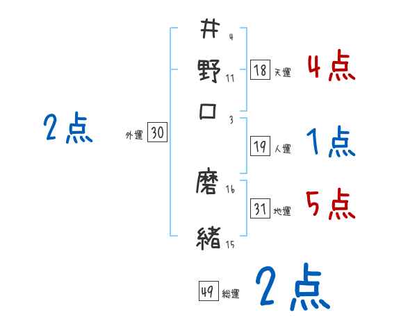 天運![]() | 井野口磨緒さんの天運は18画の4つ星!情熱的で剛気。忍耐力があり信頼される。 家系が持つ宿命的な運勢を表します。祖先から受け継いだ苗字ですので自分の力が及びません。家柄を象徴します。 |