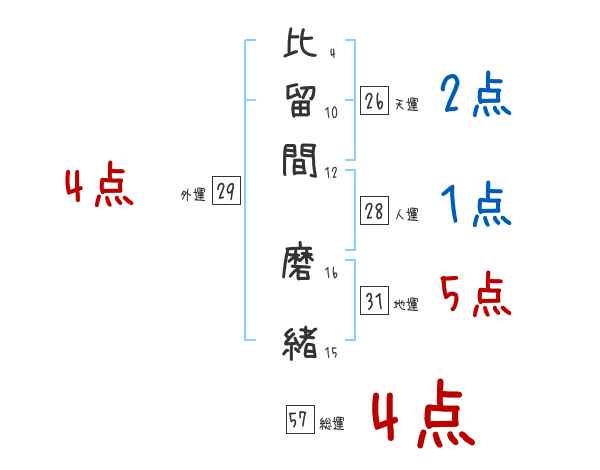 外運![]() | 比留間磨緒さんの外運は29画の4つ星!完全主義で才能がある。厳格な心の持ち主。 生活面を象徴する運勢です。外部から受ける影響力を表し、結婚運、家庭運や職場、環境への順応性を表します。 |