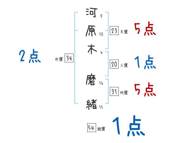 天運![]() | 河原木磨緒さんの天運は23画の5つ星!想像力に優れ活力がある。一代で成功し名誉を手に入れる。 家系が持つ宿命的な運勢を表します。祖先から受け継いだ苗字ですので自分の力が及びません。家柄を象徴します。 |