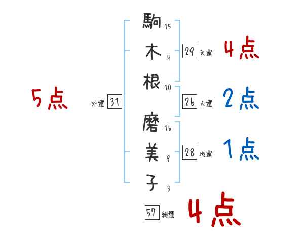 外運![]() | 駒木根磨美子さんの外運は31画の5つ星!社交性があり判断力に優れる。順風満帆な人生で円満な生活。 生活面を象徴する運勢です。外部から受ける影響力を表し、結婚運、家庭運や職場、環境への順応性を表します。 |