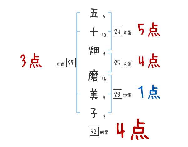 天運![]() | 五十畑磨美子さんの天運は24画の5つ星!家庭運が良く順調な人生。金運にも恵まれる。 家系が持つ宿命的な運勢を表します。祖先から受け継いだ苗字ですので自分の力が及びません。家柄を象徴します。 |