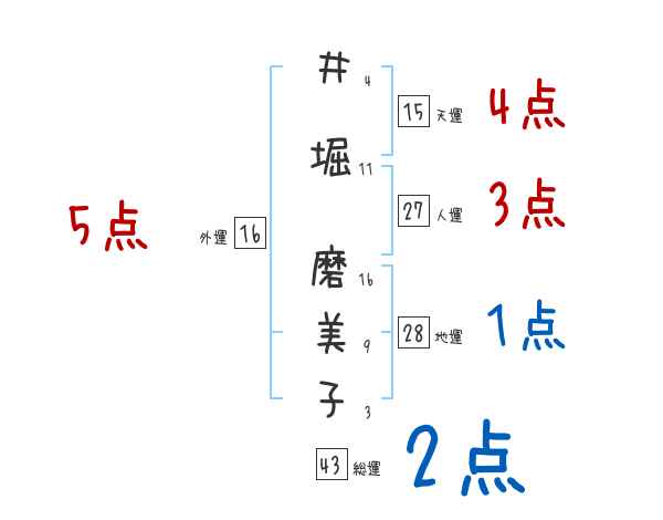 外運![]() | 井堀磨美子さんの外運は16画の5つ星!人望が厚く大きく発展する。逆転成功が見える。 生活面を象徴する運勢です。外部から受ける影響力を表し、結婚運、家庭運や職場、環境への順応性を表します。 |