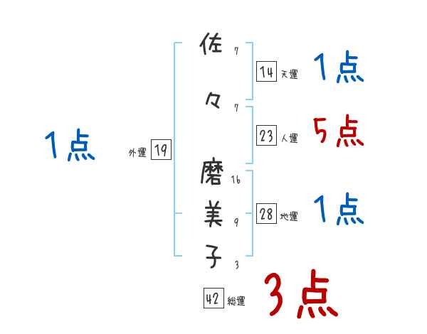 外運![]() | 佐々磨美子さんの外運は19画の1つ星!優れた才能を持ちますが、協調性が足りないことも。周りの人と協力する事を意識しましょう。 生活面を象徴する運勢です。外部から受ける影響力を表し、結婚運、家庭運や職場、環境への順応性を表します。 |