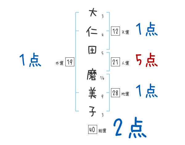 総運![]() | 大仁田磨美子さんの総運は40画の2つ星!自信過剰で物事に固執するためトラブルに注意。 あなたの人生を表す1番重要な運勢です。生涯を通じて影響する総合運となり、主に50歳以降の晩年期に影響を及ぼします。 |