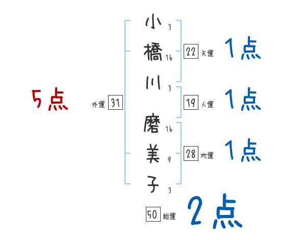 外運![]() | 小橋川磨美子さんの外運は31画の5つ星!社交性があり判断力に優れる。順風満帆な人生で円満な生活。 生活面を象徴する運勢です。外部から受ける影響力を表し、結婚運、家庭運や職場、環境への順応性を表します。 |