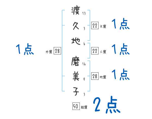 外運![]() | 渡久地磨美子さんの外運は28画の1つ星!家庭環境に注意。スポーツで活躍できる能力があるかも。 生活面を象徴する運勢です。外部から受ける影響力を表し、結婚運、家庭運や職場、環境への順応性を表します。 |
