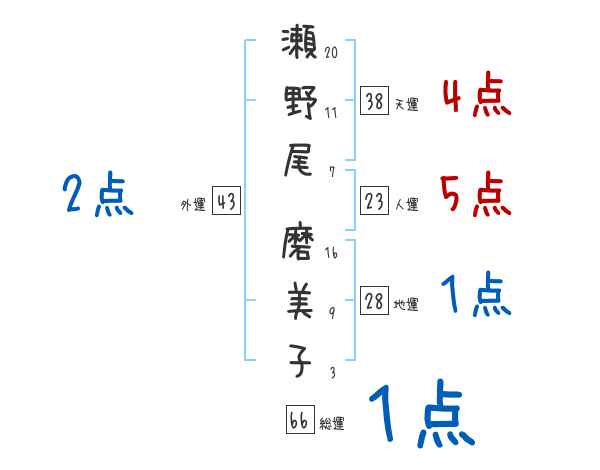 総運![]() | 瀬野尾磨美子さんの総運は66画の1つ星!迷うことが多く挫折しやすい傾向が。辛抱強く物事に取り組みましょう。 あなたの人生を表す1番重要な運勢です。生涯を通じて影響する総合運となり、主に50歳以降の晩年期に影響を及ぼします。 |