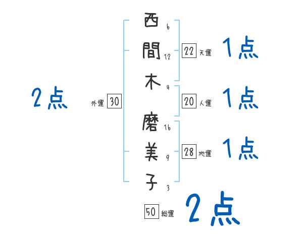 西間木磨美子さんの画数の鑑定結果