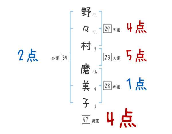 外運![]() | 野々村磨美子さんの外運は34画の2つ星!独創性に優れるが、自尊心が強く災難に注意しましょう。 生活面を象徴する運勢です。外部から受ける影響力を表し、結婚運、家庭運や職場、環境への順応性を表します。 |