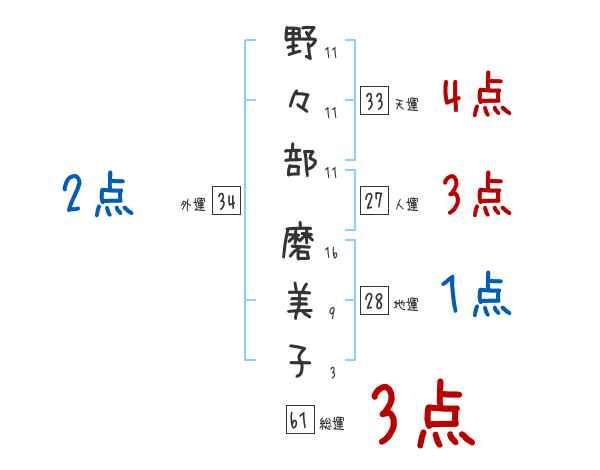 天運![]() | 野々部磨美子さんの天運は33画の4つ星!権力志向でプライドが高い。勇気があり運を切り開き成功する。 家系が持つ宿命的な運勢を表します。祖先から受け継いだ苗字ですので自分の力が及びません。家柄を象徴します。 |