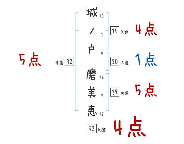 外運![]() | 城ノ戸磨美恵さんの外運は32画の5つ星!柔軟性があり成功する。チャンスが多く金運が良い。 生活面を象徴する運勢です。外部から受ける影響力を表し、結婚運、家庭運や職場、環境への順応性を表します。 |