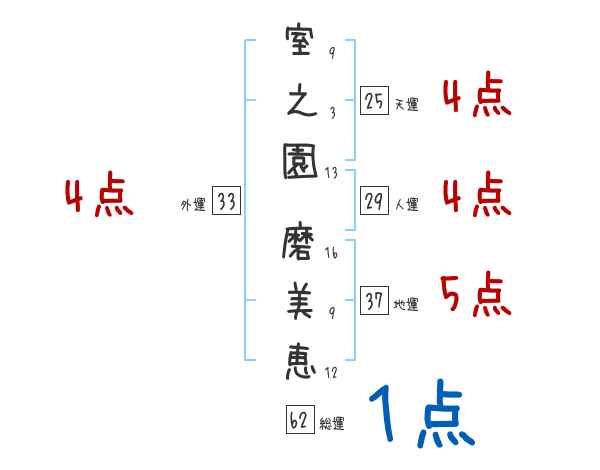 外運![]() | 室之園磨美恵さんの外運は33画の4つ星!権力志向でプライドが高い。勇気があり運を切り開き成功する。 生活面を象徴する運勢です。外部から受ける影響力を表し、結婚運、家庭運や職場、環境への順応性を表します。 |