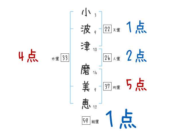 外運![]() | 小波津磨美恵さんの外運は33画の4つ星!権力志向でプライドが高い。勇気があり運を切り開き成功する。 生活面を象徴する運勢です。外部から受ける影響力を表し、結婚運、家庭運や職場、環境への順応性を表します。 |