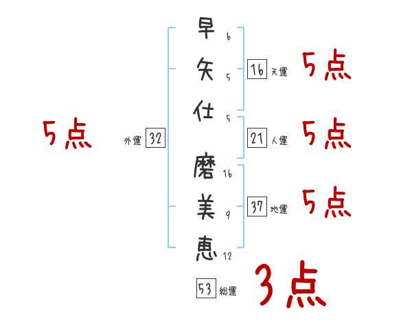 外運![]() | 早矢仕磨美恵さんの外運は32画の5つ星!柔軟性があり成功する。チャンスが多く金運が良い。 生活面を象徴する運勢です。外部から受ける影響力を表し、結婚運、家庭運や職場、環境への順応性を表します。 |
