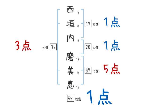 外運![]() | 西垣内磨美恵さんの外運は36画の3つ星!先見性が豊かです。多少神経質で苦労することも。 生活面を象徴する運勢です。外部から受ける影響力を表し、結婚運、家庭運や職場、環境への順応性を表します。 |