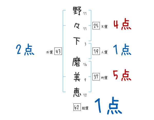 天運![]() | 野々下磨美恵さんの天運は25画の4つ星!個性があり才能があふれる。強運の持ち主で発展する。 家系が持つ宿命的な運勢を表します。祖先から受け継いだ苗字ですので自分の力が及びません。家柄を象徴します。 |