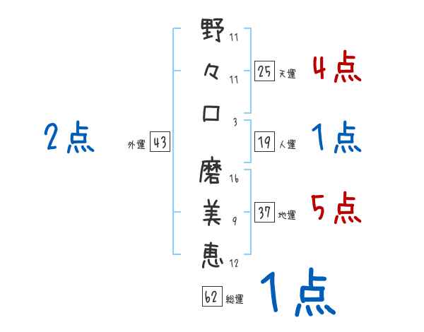天運![]() | 野々口磨美恵さんの天運は25画の4つ星!個性があり才能があふれる。強運の持ち主で発展する。 家系が持つ宿命的な運勢を表します。祖先から受け継いだ苗字ですので自分の力が及びません。家柄を象徴します。 |