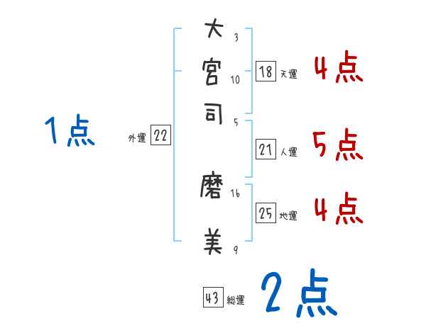 総運![]() | 大宮司磨美さんの総運は43画の2つ星!頑固な性格で独立心が強いかも。やや非現実的で浪費に注意しましょう。 あなたの人生を表す1番重要な運勢です。生涯を通じて影響する総合運となり、主に50歳以降の晩年期に影響を及ぼします。 |