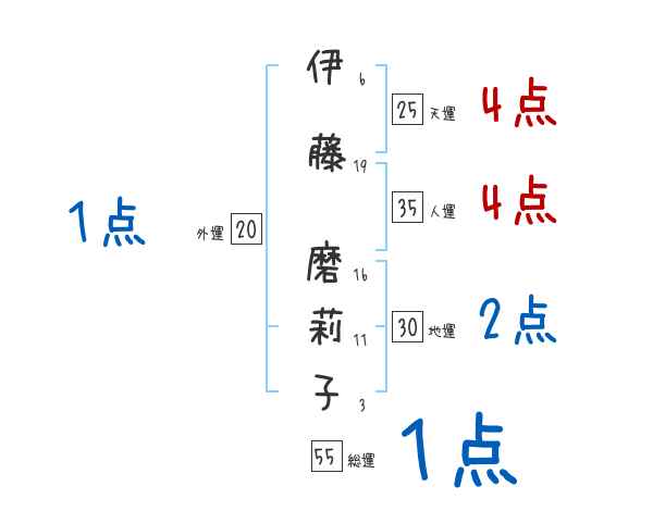 天運![]() | 伊藤磨莉子さんの天運は25画の4つ星!個性があり才能があふれる。強運の持ち主で発展する。 家系が持つ宿命的な運勢を表します。祖先から受け継いだ苗字ですので自分の力が及びません。家柄を象徴します。 |