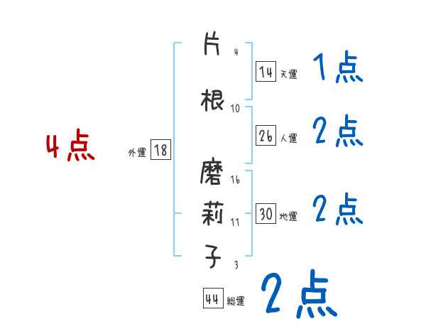 外運![]() | 片根磨莉子さんの外運は18画の4つ星!情熱的で剛気。忍耐力があり信頼される。 生活面を象徴する運勢です。外部から受ける影響力を表し、結婚運、家庭運や職場、環境への順応性を表します。 |