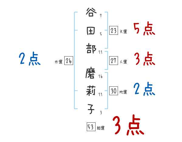外運![]() | 谷田部磨莉子さんの外運は26画の2つ星!波瀾万丈かも。信頼できる人を大事にしましょう。 生活面を象徴する運勢です。外部から受ける影響力を表し、結婚運、家庭運や職場、環境への順応性を表します。 |