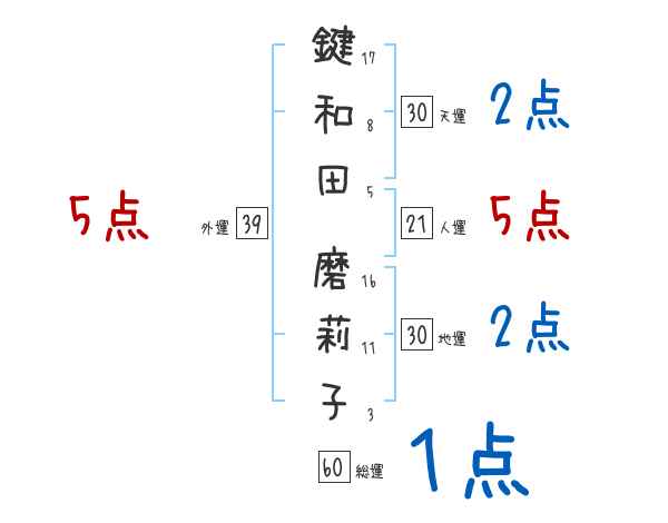 外運![]() | 鍵和田磨莉子さんの外運は39画の5つ星!社交性に優れ人望が厚い。人の上に立ち成功する。 生活面を象徴する運勢です。外部から受ける影響力を表し、結婚運、家庭運や職場、環境への順応性を表します。 |