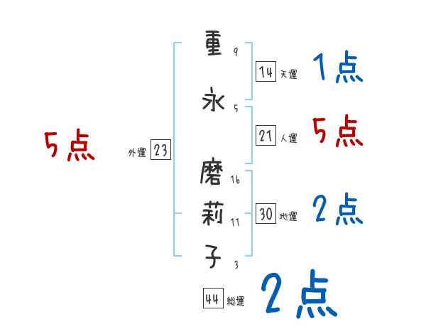 人運![]() | 重永磨莉子さんの人運は21画の5つ星!統率力がある。独立し成功する。名誉を手に入れる。 性格や才能などを表す2番目に重要な運勢です。人間関係や協調性、社会的な成功に影響します。主に20歳から50歳ぐらいまでの中年期の運勢を表します。 |