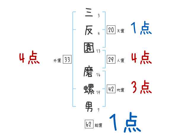 外運![]() | 三反園磨螺男さんの外運は33画の4つ星!権力志向でプライドが高い。勇気があり運を切り開き成功する。 生活面を象徴する運勢です。外部から受ける影響力を表し、結婚運、家庭運や職場、環境への順応性を表します。 |