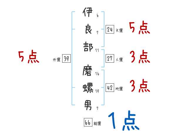 地運![]() | 伊良部磨螺男さんの地運は42画の3つ星!病気に注意。多芸であるが消極的でおとなしい。 個性を表す基礎的な運勢です。性格形成や対人関係、行動力など家庭環境に影響されます。主に誕生してから20歳くらいまでの若年期の運勢を表します。 |