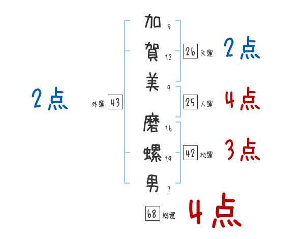 | 天運  | 加賀美磨螺男さんの天運は26画の2つ星!波瀾万丈かも。信頼できる人を大事にしましょう。家系が持つ宿命的な運勢を表します。祖先から受け継いだ苗字ですので自分の力が及びません。家柄を象徴します。 |