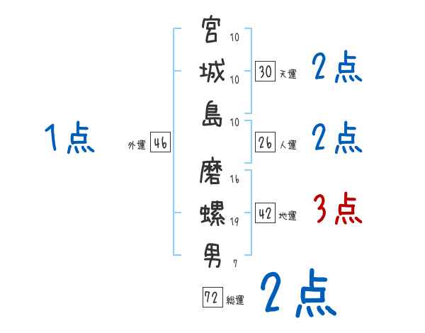 天運![]() | 宮城島磨螺男さんの天運は30画の2つ星!浮き沈みの激しさに注意しましょう。 家系が持つ宿命的な運勢を表します。祖先から受け継いだ苗字ですので自分の力が及びません。家柄を象徴します。 |
