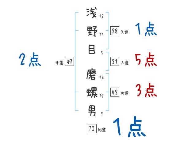 地運![]() | 浅野目磨螺男さんの地運は42画の3つ星!病気に注意。多芸であるが消極的でおとなしい。 個性を表す基礎的な運勢です。性格形成や対人関係、行動力など家庭環境に影響されます。主に誕生してから20歳くらいまでの若年期の運勢を表します。 |