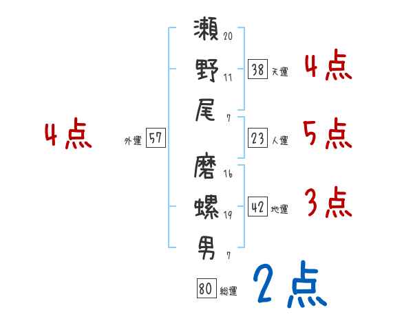 瀬野尾磨螺男さんの画数の鑑定結果
