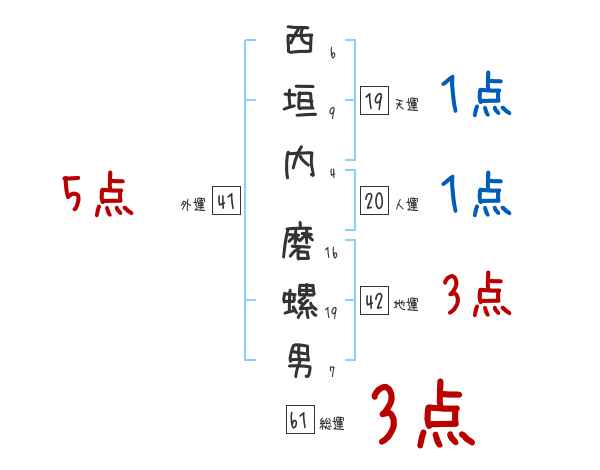地運![]() | 西垣内磨螺男さんの地運は42画の3つ星!病気に注意。多芸であるが消極的でおとなしい。 個性を表す基礎的な運勢です。性格形成や対人関係、行動力など家庭環境に影響されます。主に誕生してから20歳くらいまでの若年期の運勢を表します。 |