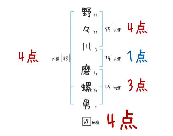 地運![]() | 野々川磨螺男さんの地運は42画の3つ星!病気に注意。多芸であるが消極的でおとなしい。 個性を表す基礎的な運勢です。性格形成や対人関係、行動力など家庭環境に影響されます。主に誕生してから20歳くらいまでの若年期の運勢を表します。 |