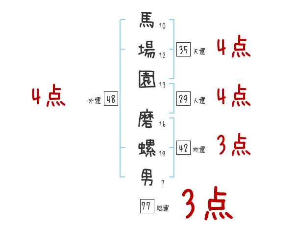 総運![]() | 馬場園磨螺男さんの総運は77画の3つ星!多少不安定であるが晩年は吉。不屈の精神。 あなたの人生を表す1番重要な運勢です。生涯を通じて影響する総合運となり、主に50歳以降の晩年期に影響を及ぼします。 |