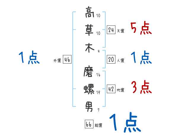 天運![]() | 高草木磨螺男さんの天運は24画の5つ星!家庭運が良く順調な人生。金運にも恵まれる。 家系が持つ宿命的な運勢を表します。祖先から受け継いだ苗字ですので自分の力が及びません。家柄を象徴します。 |