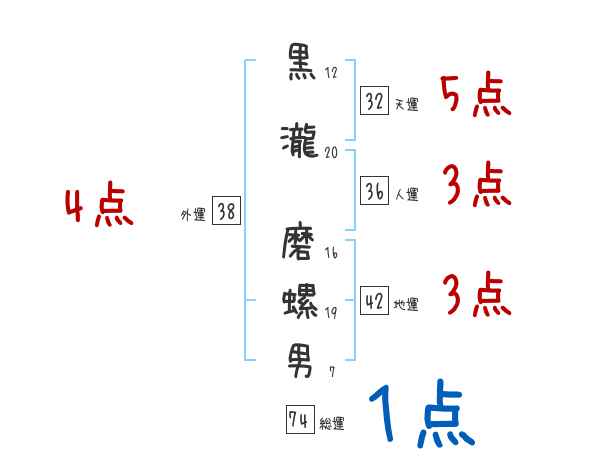 天運![]() | 黒瀧磨螺男さんの天運は32画の5つ星!柔軟性があり成功する。チャンスが多く金運が良い。 家系が持つ宿命的な運勢を表します。祖先から受け継いだ苗字ですので自分の力が及びません。家柄を象徴します。 |