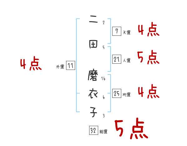 総運![]() | 二田磨衣子さんの総運は32画の5つ星!柔軟性があり成功する。チャンスが多く金運が良い。 あなたの人生を表す1番重要な運勢です。生涯を通じて影響する総合運となり、主に50歳以降の晩年期に影響を及ぼします。 |