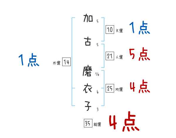 外運![]() | 加古磨衣子さんの外運は14画の1つ星!人に対して優しいがストレスを溜め込みがち。人間関係のトラブルを避けるよう気をつけましょう。 生活面を象徴する運勢です。外部から受ける影響力を表し、結婚運、家庭運や職場、環境への順応性を表します。 |
