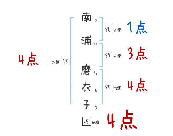 外運![]() | 南浦磨衣子さんの外運は18画の4つ星!情熱的で剛気。忍耐力があり信頼される。 生活面を象徴する運勢です。外部から受ける影響力を表し、結婚運、家庭運や職場、環境への順応性を表します。 |